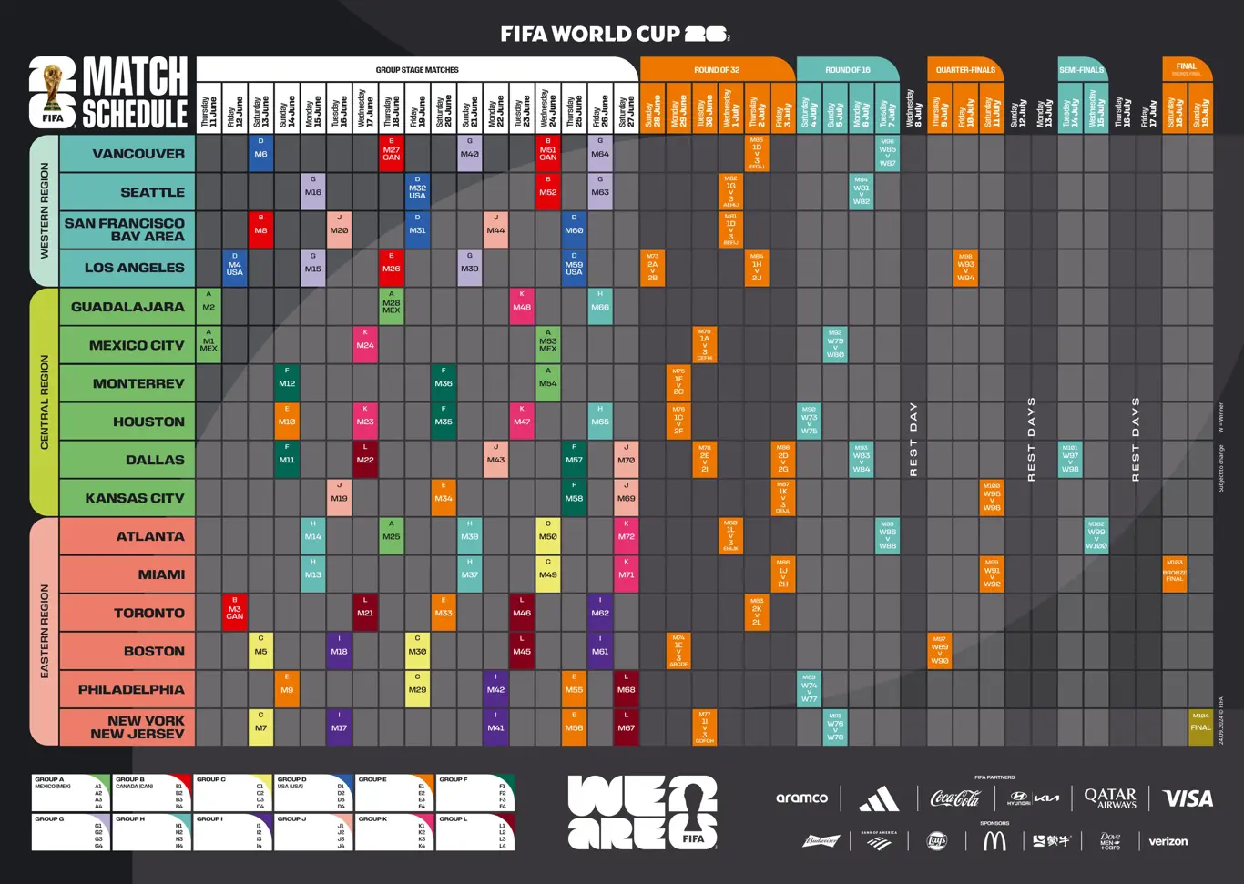 作为史上规模最大的全球性赛事,本届世界杯将有 48 支球队在加拿大、墨西哥和美国三个国家的 16 个主办城市进行 104 场比赛。